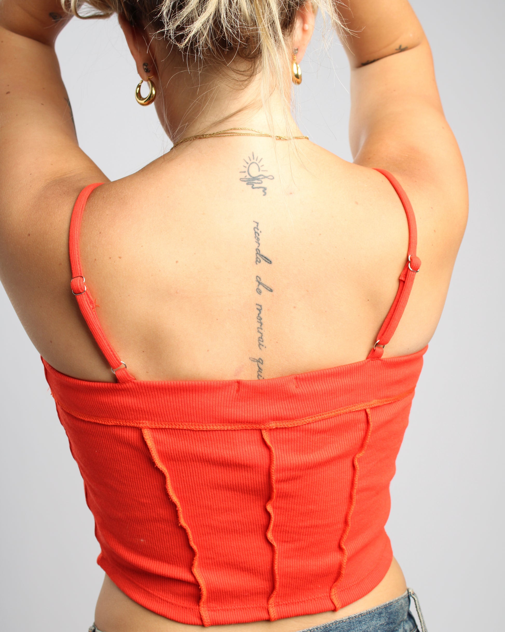 This square neck rib fabric has flattering seam details in the front and back. The fitted top is paired with our Blue Dark Wash Jean Shorts.